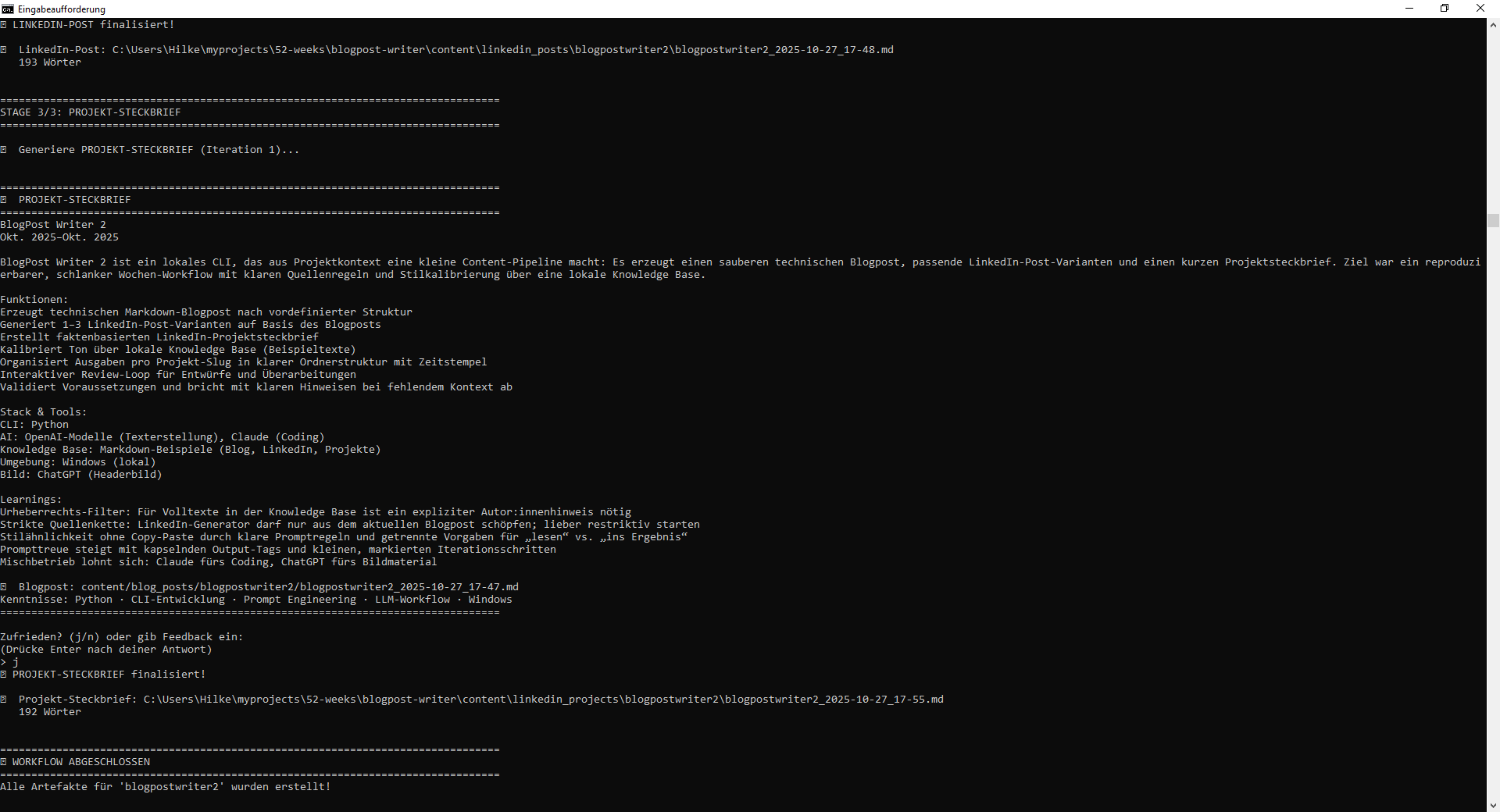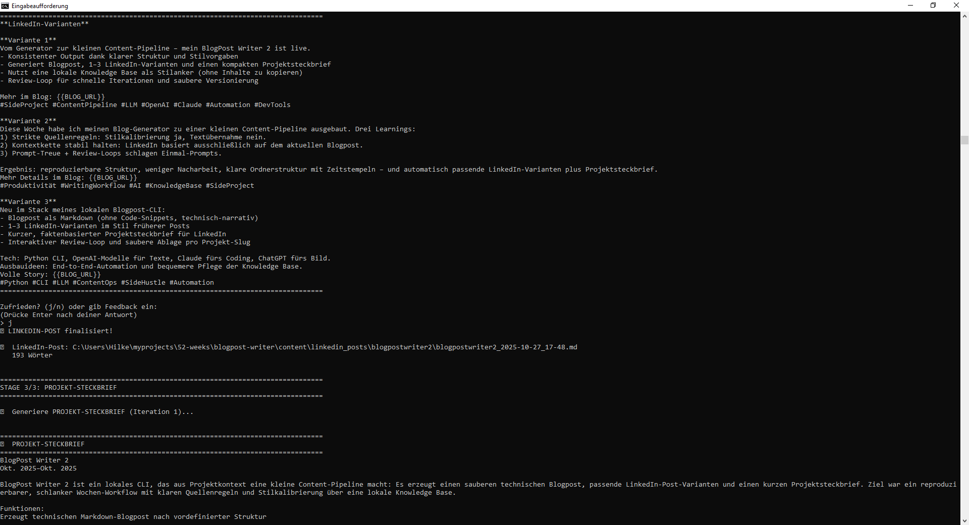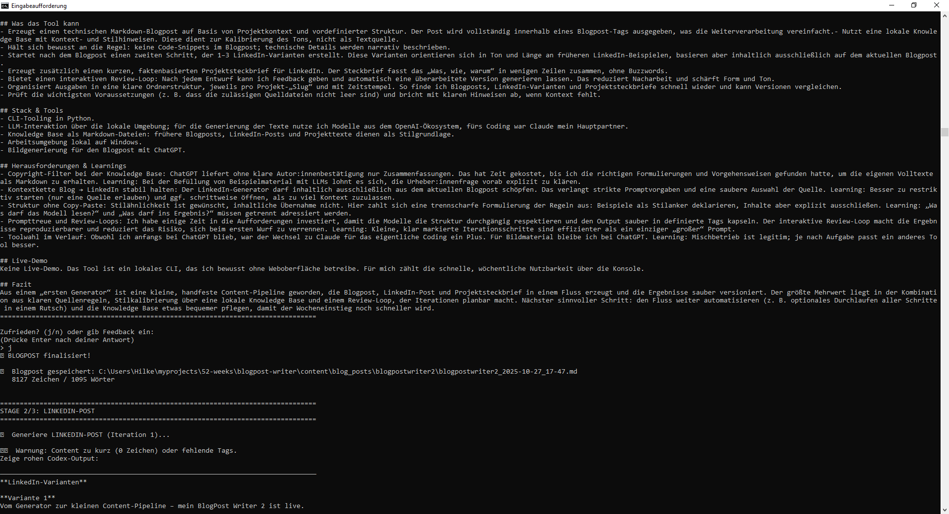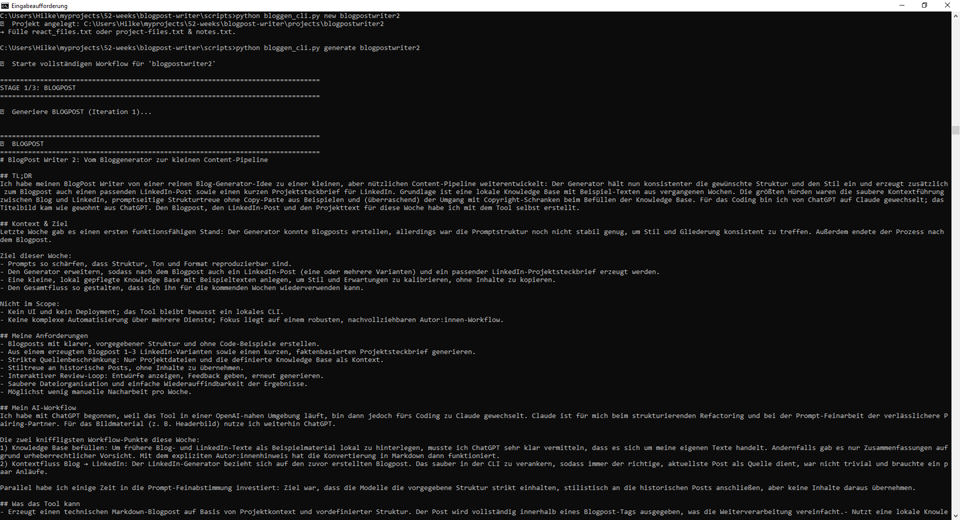 - Kontextfluss Blog → LinkedIn: Der LinkedIn-Generator bezieht sich auf den zuvor erstellten Blogpost. Das sauber in der CLI zu verankern, sodass immer der richtige, aktuellste Post als Quelle dient, war nicht trivial und brauchte ein paar Anläufe.