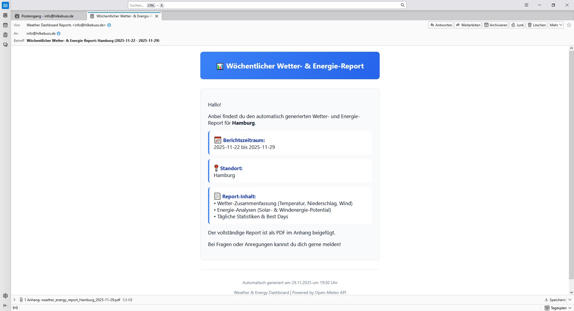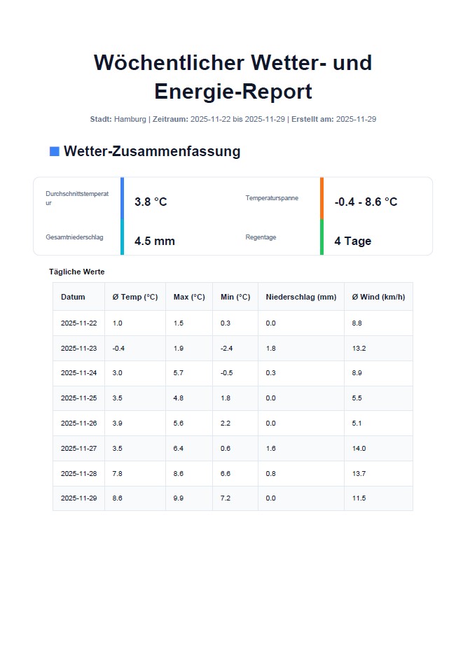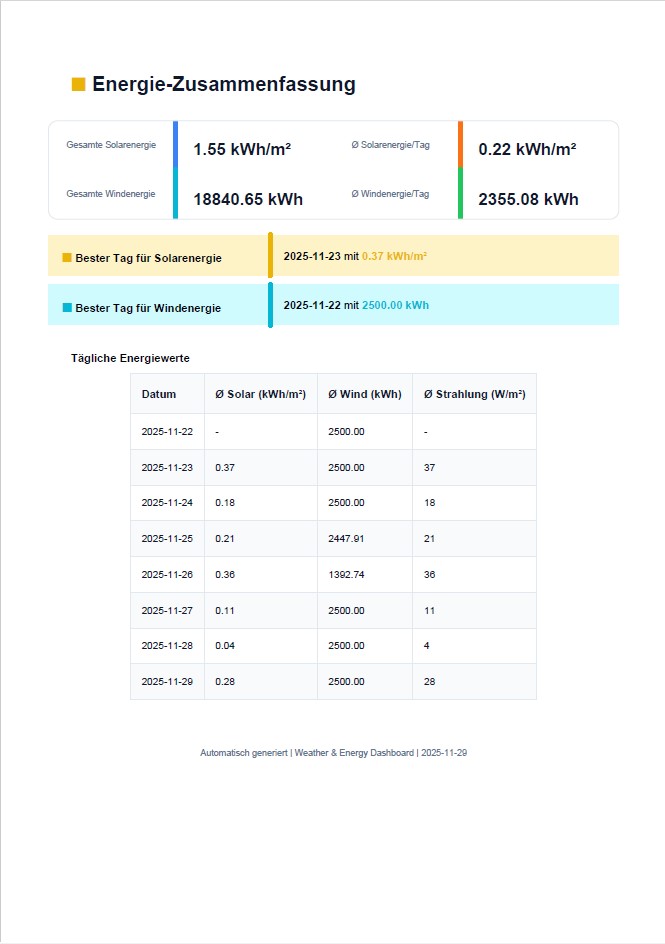 👉 Der Report fasst das Wesentliche zusammen: Wetter‑Durchschnittswerte und Spannen, Gesamtniederschlag, Regentage sowie Energie‑Indikatoren wie Solar‑ und Windpotenzial – alles konsistent aus derselben Datenbank wie das Dashboard