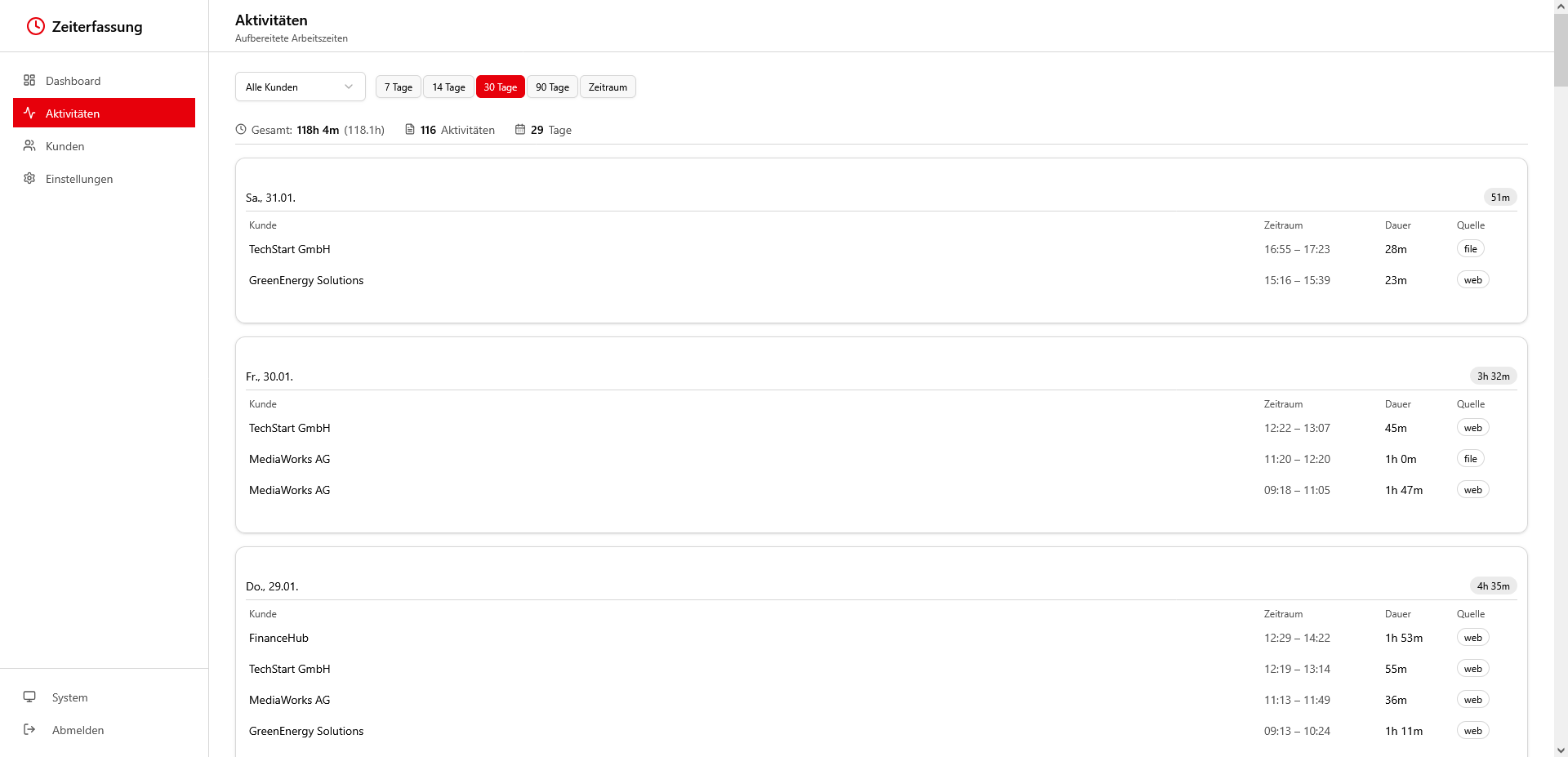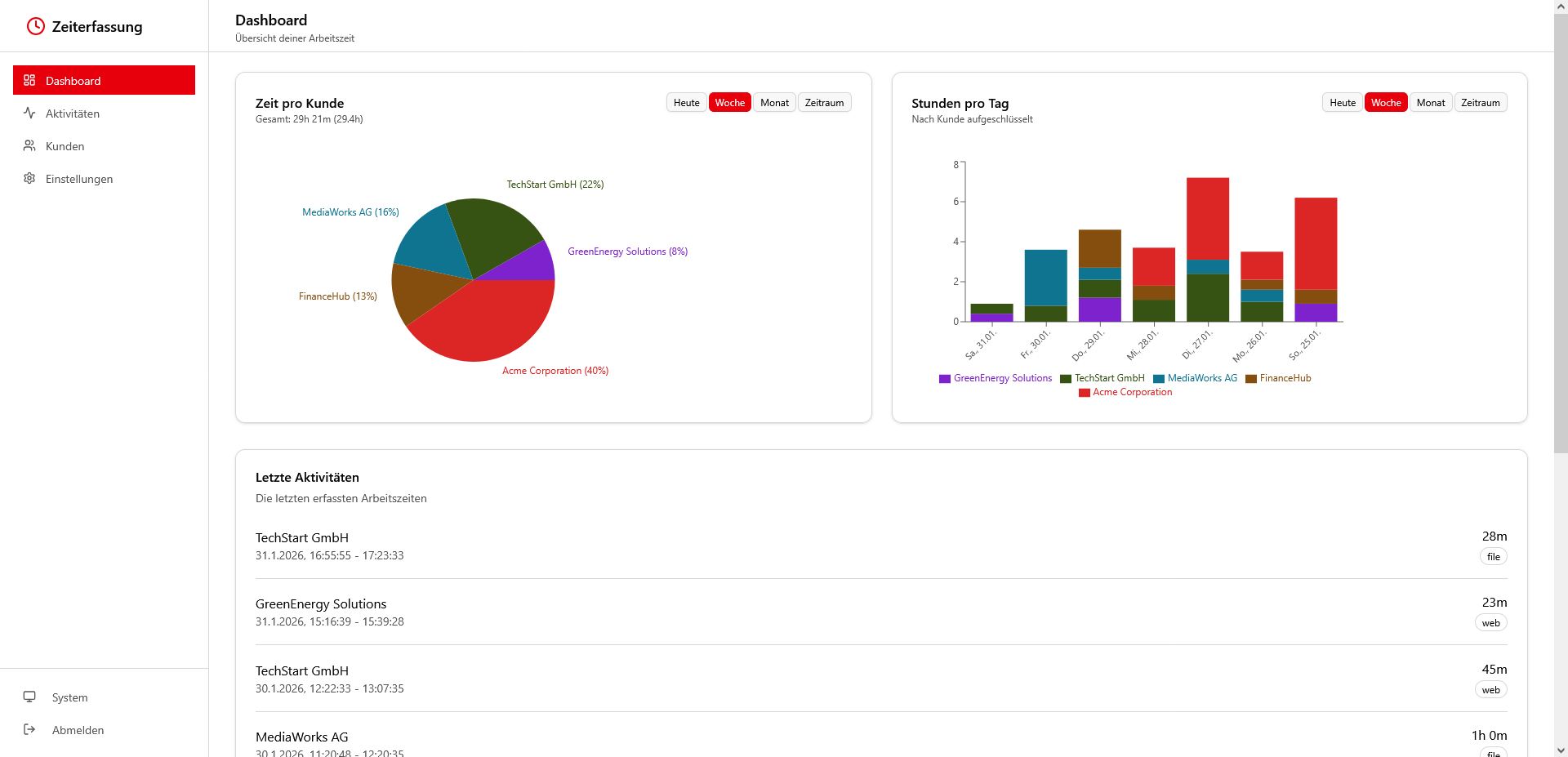 👉 Im Dashboard siehst du Tages‑ und Wochenansichten mit kumulierten Zeiten je Kunde.