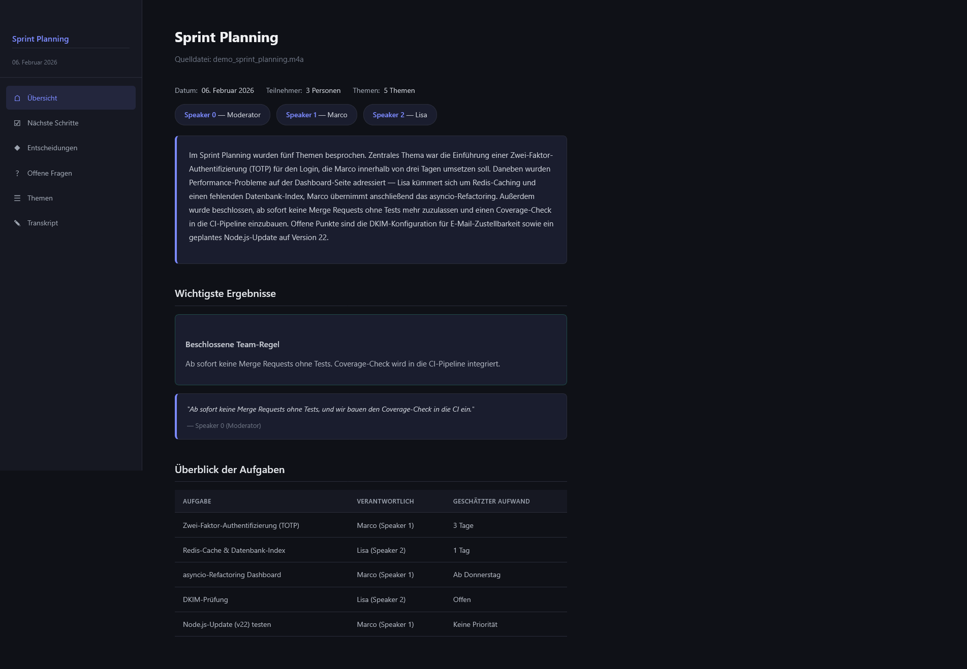 👉 Der Fokus liegt auf Umsetzbarkeit: Am Ende weiß man, wer was bis wann macht – ohne langes Scrollen durch Roh‑Transkripte