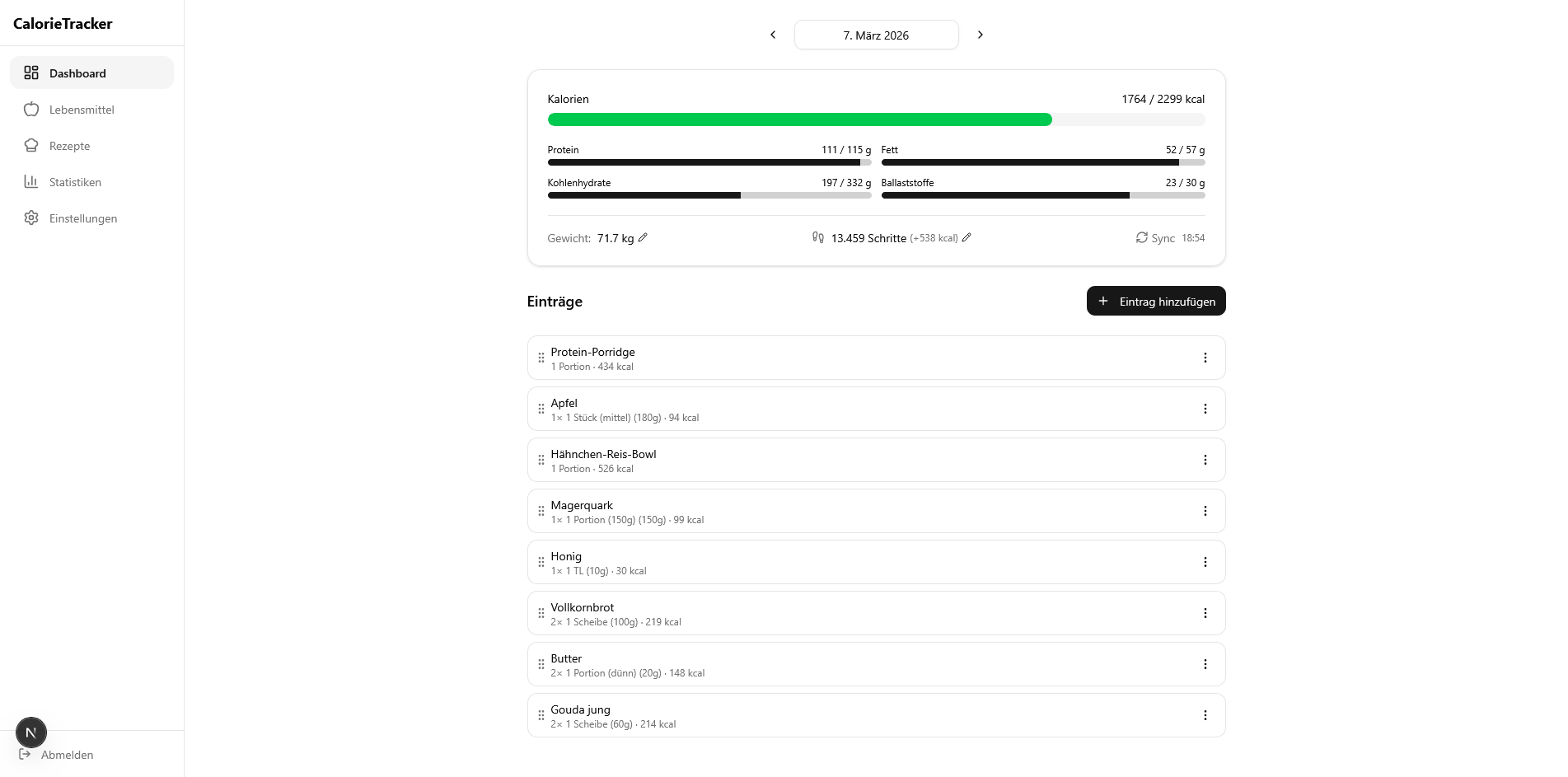 👉 Beim Öffnen landet man direkt auf einer Tagesansicht, die das aktuelle Kalorienbudget zeigt, die bereits gegessenen Kalorien summiert und wie viel „Luft“ noch bleibt.