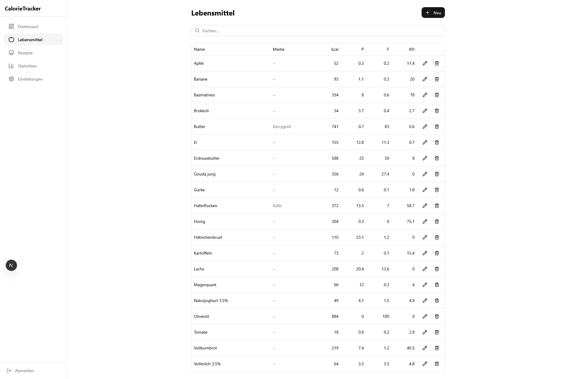 👉 Lebensmittel lassen sich in einer eigenen Datenbank pflegen. Ein Produkt kann mit Nährwerten pro 100 g hinterlegt werden, optional mit vordefinierten Portionen wie „1 Scheibe“.